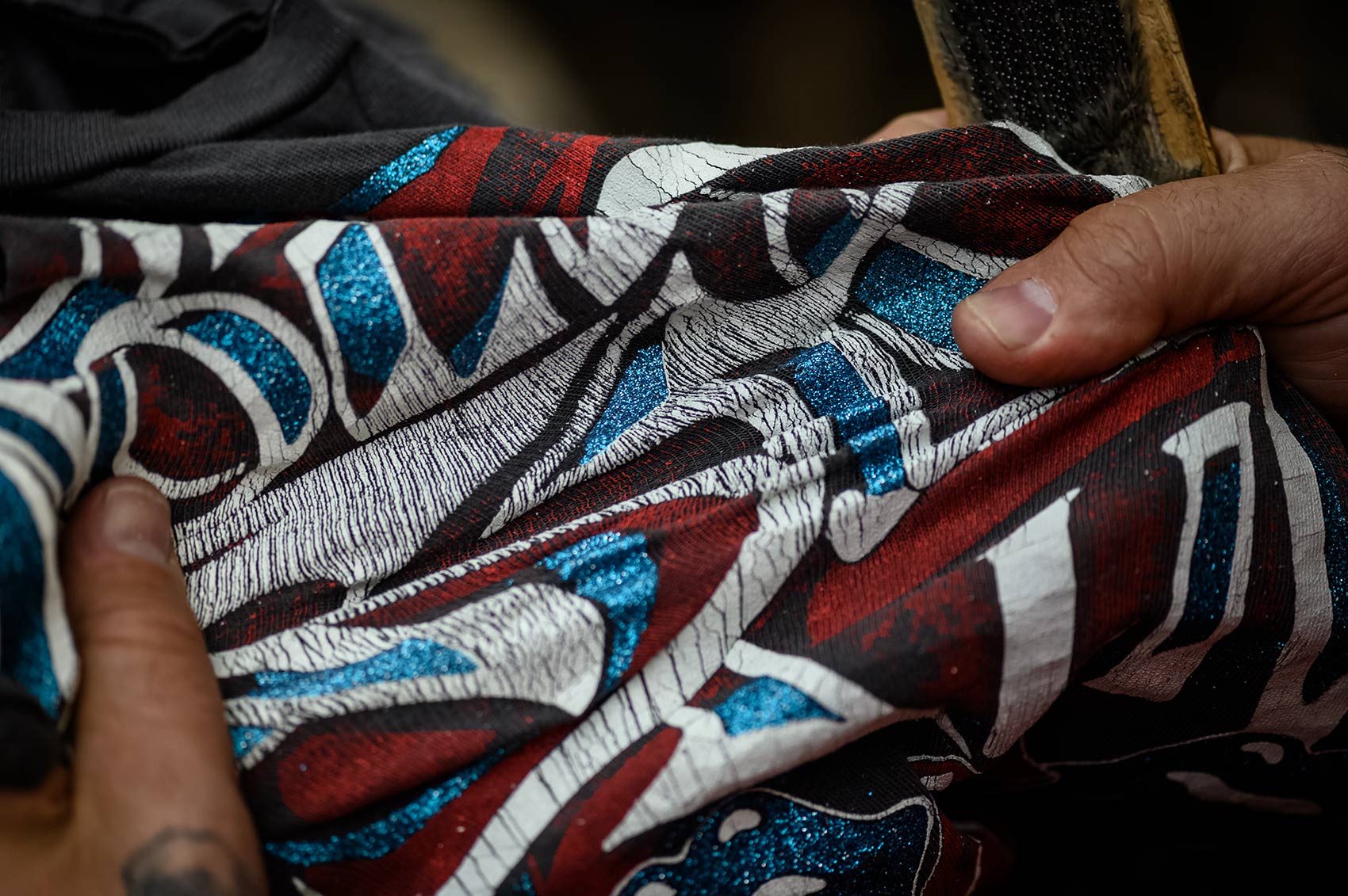 After the printing process, each garment then travels to our studio in Hollywood for finishing where we sand, stretch, paint, patch - and occasionally burn to perfection.